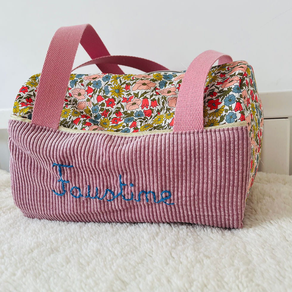La jupe est elastiquée à la taille et le tissu comporte des fleurs dans des coloris bleus et orangés.